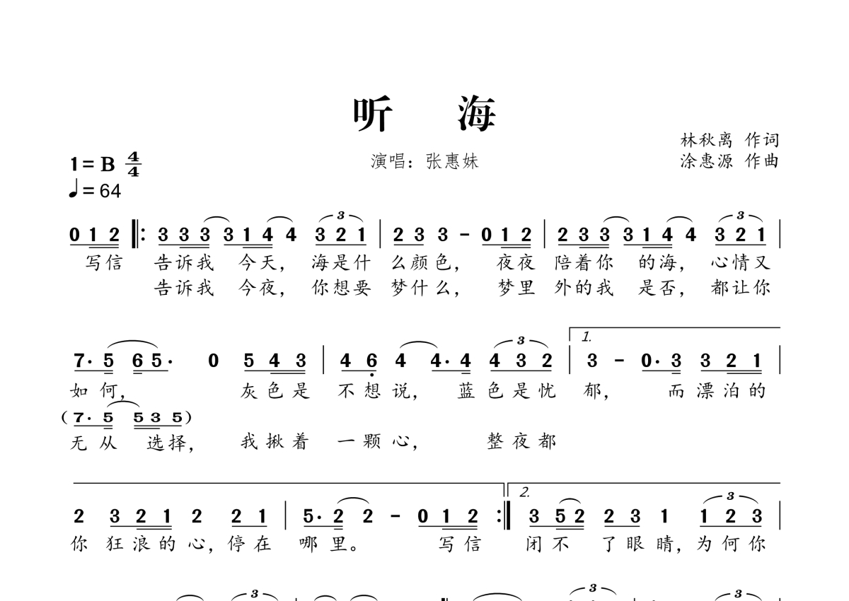 《听海》是张惠妹演唱的一首歌曲,拍号为4/4拍,歌曲速度为每分钟64拍,这份简谱共有一张高清图谱,图谱由 @桃李醉春风 编配上传。