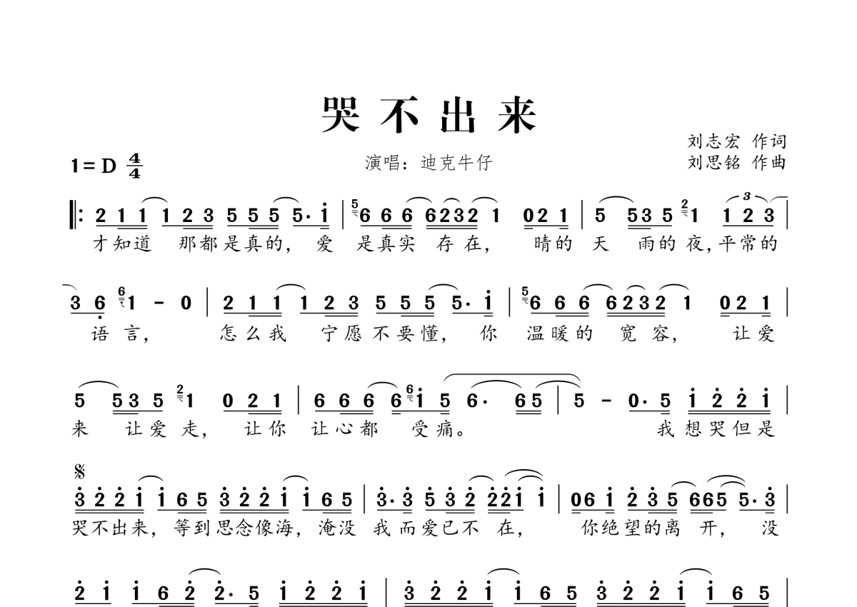 《哭不出来》是迪克牛仔演唱的一首歌曲,拍号为4/4拍,这份简谱共有一张高清图谱,图谱由 @桃李醉春风 编配上传。