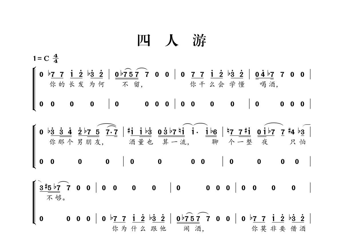 《四人游》,拍号为4/4拍,这份简谱共有三张高清图谱,图谱由 @桃李醉春风 编配上传。