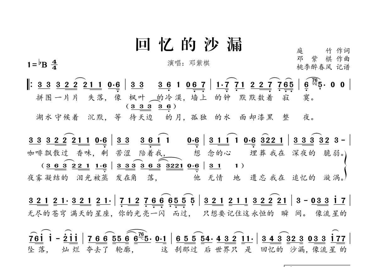 《回忆的沙漏》是G.E.M.邓紫棋演唱的一首歌曲,拍号为4/4拍,这份简谱共有一张高清图谱,图谱由 @桃李醉春风 编配上传。