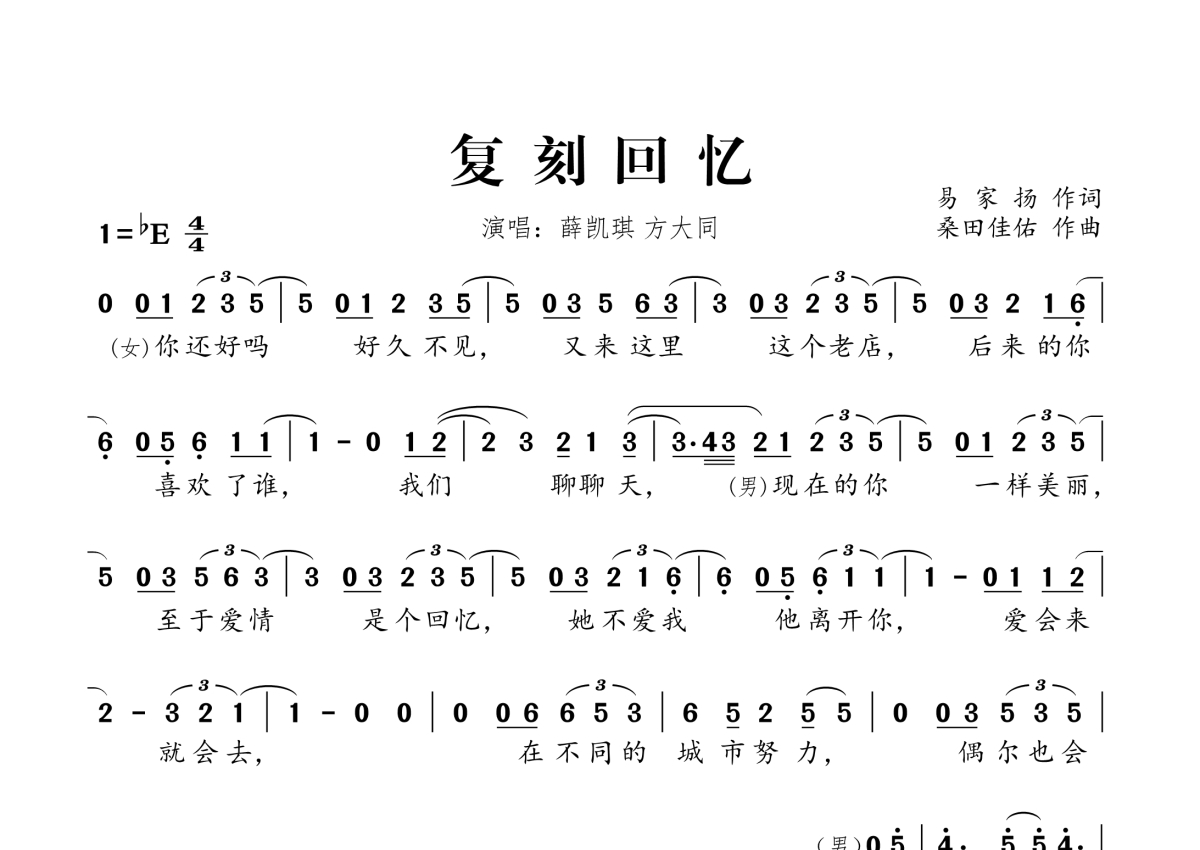 《复刻回忆》是薛凯琪&方大同演唱的一首歌曲,拍号为4/4拍,这份简谱共有三张高清图谱,图谱由 @桃李醉春风 编配上传。