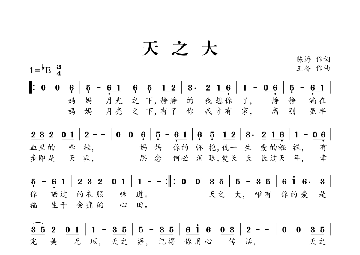 《天之大》,拍号为3/4拍,这份简谱共有一张高清图谱,图谱由 @桃李醉春风 编配上传。