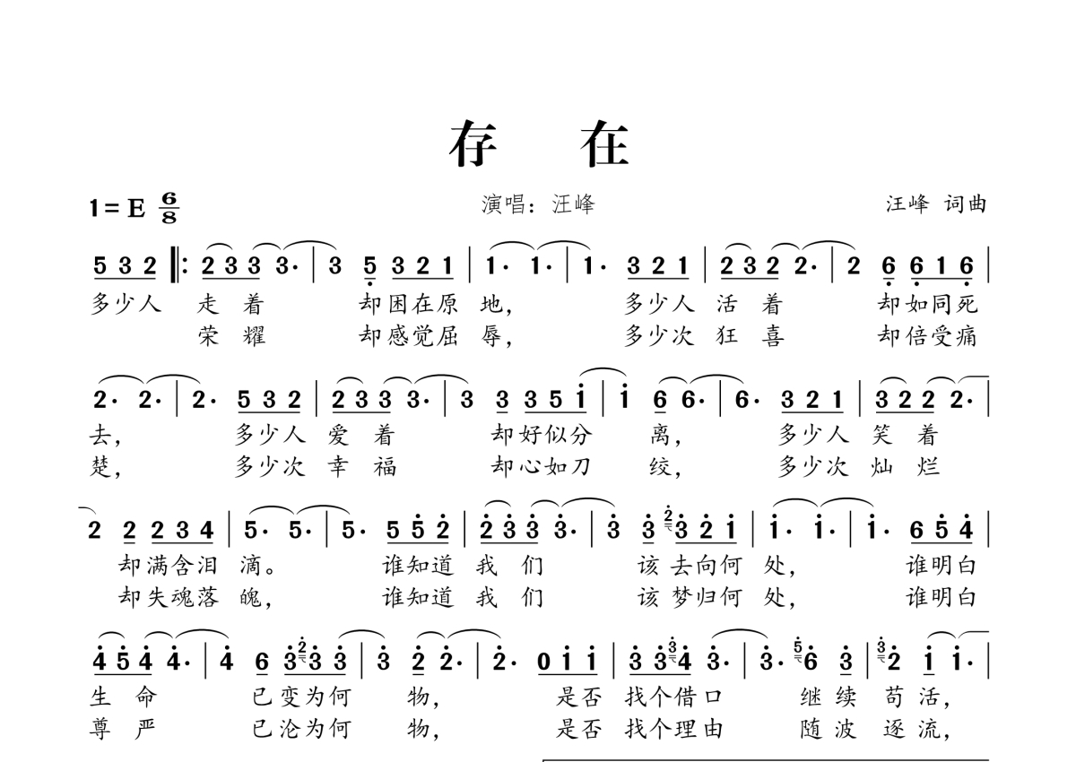 《存在》是汪峰演唱的一首歌曲,拍号为6/8拍,这份简谱共有一张高清图谱,图谱由 @桃李醉春风 编配上传。