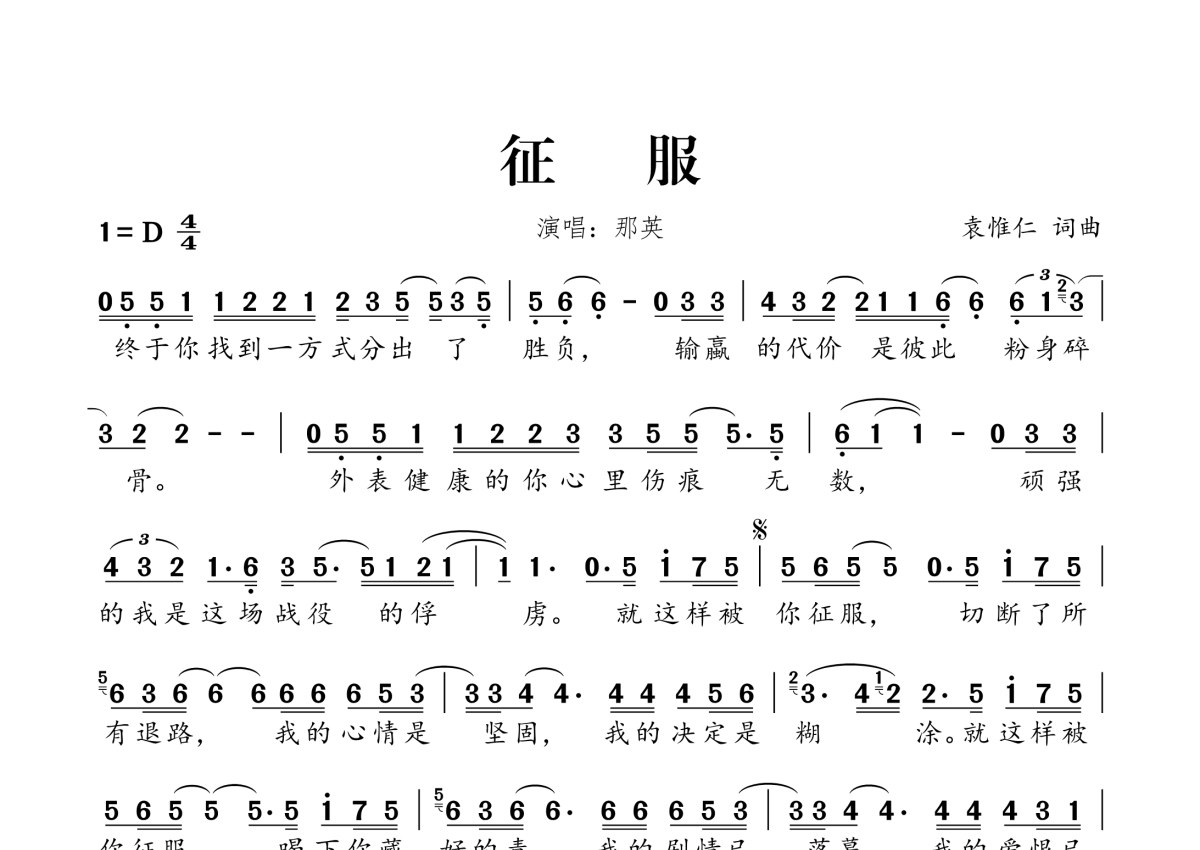 《征服》是那英演唱的一首歌曲,拍号为4/4拍,这份简谱共有一张高清图谱,图谱由 @桃李醉春风 编配上传。