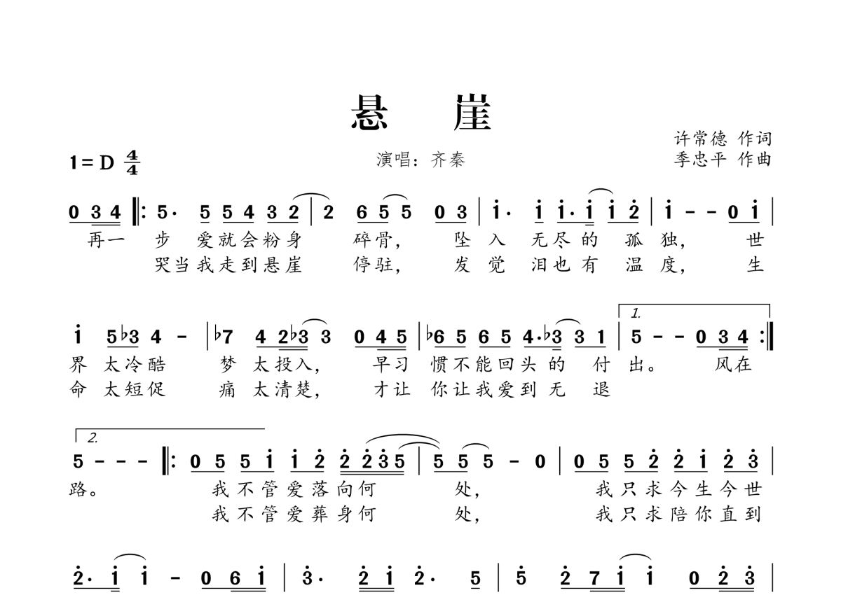 《悬崖》是齐秦演唱的一首歌曲,拍号为4/4拍,这份简谱共有一张高清图谱,图谱由 @桃李醉春风 编配上传。