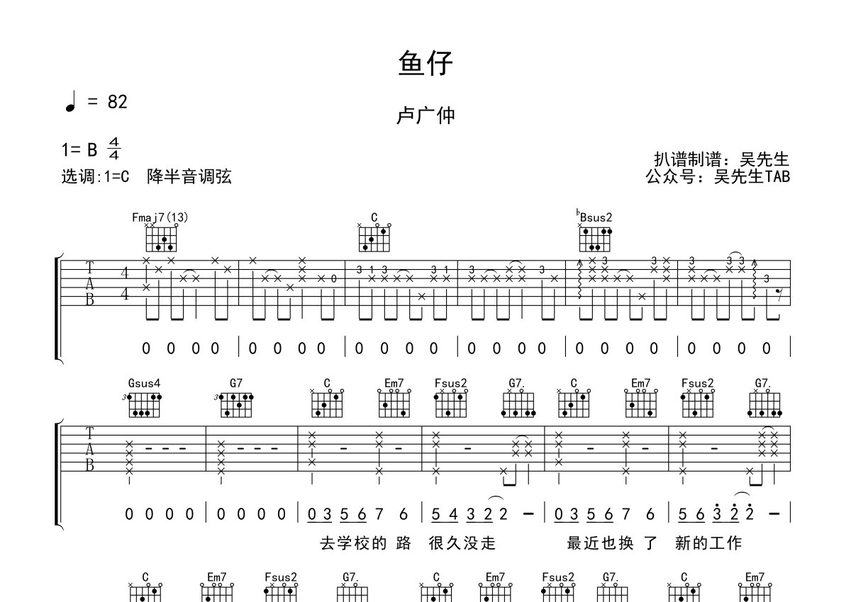 卢广仲《鱼仔》吉他谱 - C调弹唱六线谱