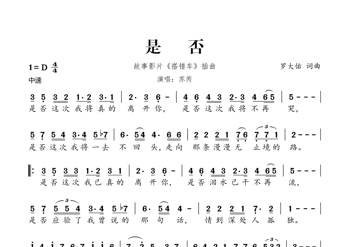 《是否》是苏芮演唱的一首歌曲,拍号为4/4拍,这份简谱共有一张高清图谱,图谱由 @桃李醉春风 编配上传。