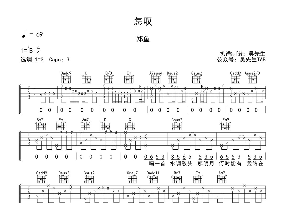 郑鱼《怎叹》吉他谱 - G调弹唱六线谱