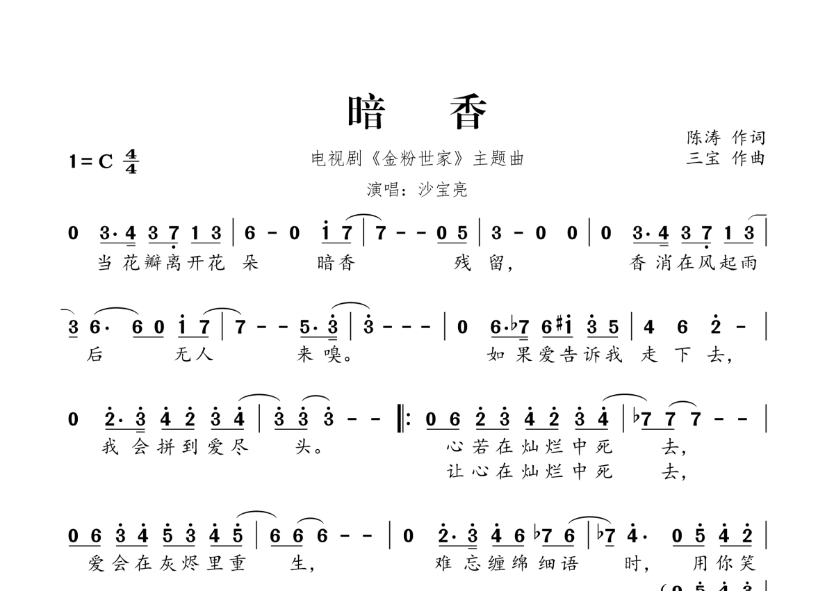 《暗香》是沙宝亮演唱的一首歌曲,拍号为4/4拍,这份简谱共有一张高清图谱,图谱由 @桃李醉春风 编配上传。
