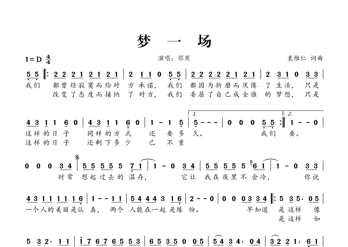《梦一场》是那英演唱的一首歌曲,拍号为4/4拍,这份简谱共有一张高清图谱,图谱由 @桃李醉春风 编配上传。