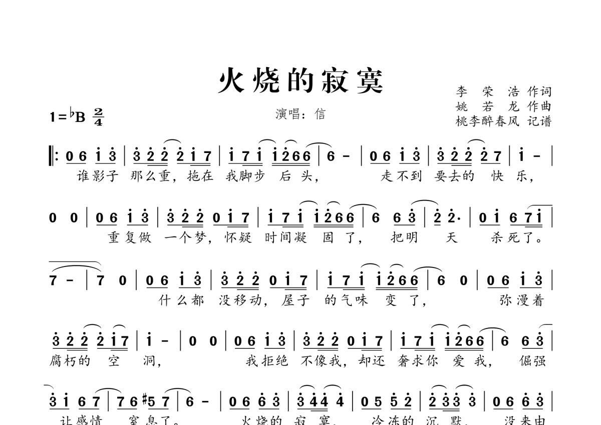 《火烧的寂寞》是苏见信 (信)演唱的一首歌曲,拍号为2/4拍,这份简谱共有一张高清图谱,图谱由 @桃李醉春风 编配上传。