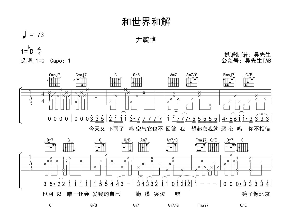 《和世界和解》是尹毓恪演唱的一首歌曲,本吉他谱采用的是C调指法编配,这份吉他谱共有两张高清图谱,图谱由 @吴先生TAB 编配上传,图谱使用六线谱编配,包含吉他和弦指法、简谱以及歌词部分,使用这份和世界和解吉他谱,可以让你更加方便地掌握这首歌曲的弹唱技巧,快来尝试吧。尹毓恪《和世界和解》吉他谱_C调吉他弹唱谱。