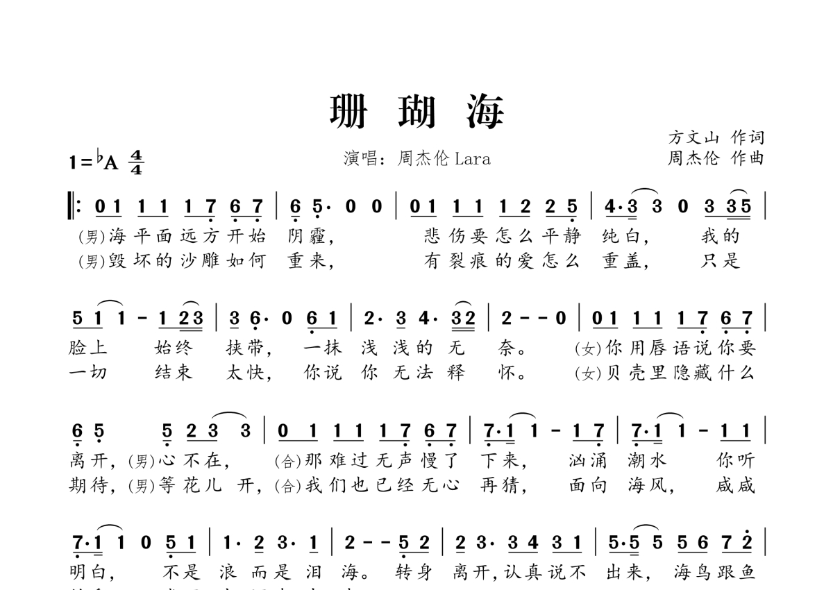 《珊瑚海》是周杰伦&Lara梁心颐演唱的一首歌曲,拍号为4/4拍,这份简谱共有一张高清图谱,图谱由 @桃李醉春风 编配上传。