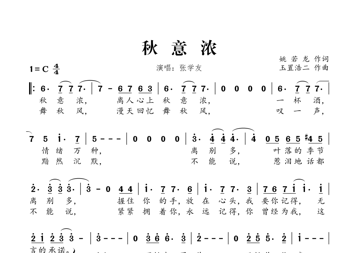 《秋意浓》是张学友演唱的一首歌曲,拍号为4/4拍,这份简谱共有一张高清图谱,图谱由 @桃李醉春风 编配上传。