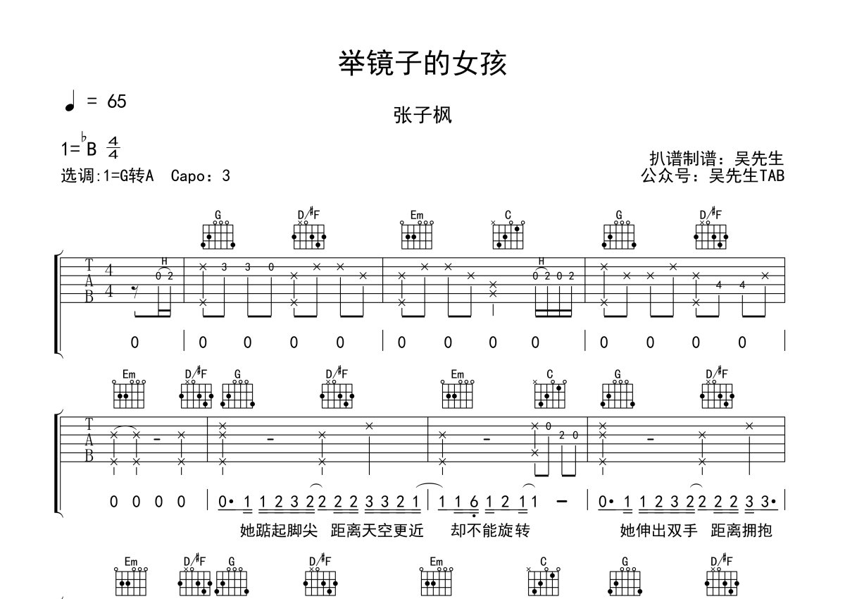 《举镜子的女孩》是张子枫演唱的一首歌曲,本吉他谱采用的是G调指法编配,这份吉他谱共有三张高清图谱,图谱由 @吴先生TAB 编配上传,图谱使用六线谱编配,包含吉他和弦指法、简谱以及歌词部分,使用这份举镜子的女孩吉他谱,可以让你更加方便地掌握这首歌曲的弹唱技巧,快来尝试吧。张子枫《举镜子的女孩》吉他谱_G调吉他弹唱谱。