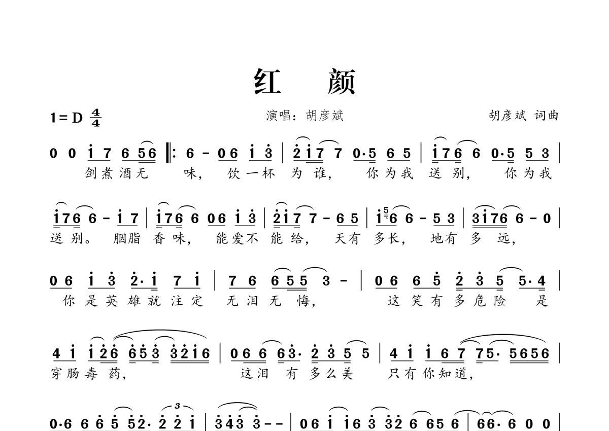 《红颜》是胡彦斌演唱的一首歌曲,拍号为4/4拍,这份简谱共有一张高清图谱,图谱由 @桃李醉春风 编配上传。