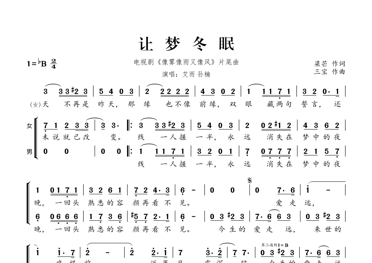 《让梦冬眠》是孙楠&艾雨演唱的一首歌曲,拍号为2/4拍,这份简谱共有一张高清图谱,图谱由 @桃李醉春风 编配上传。