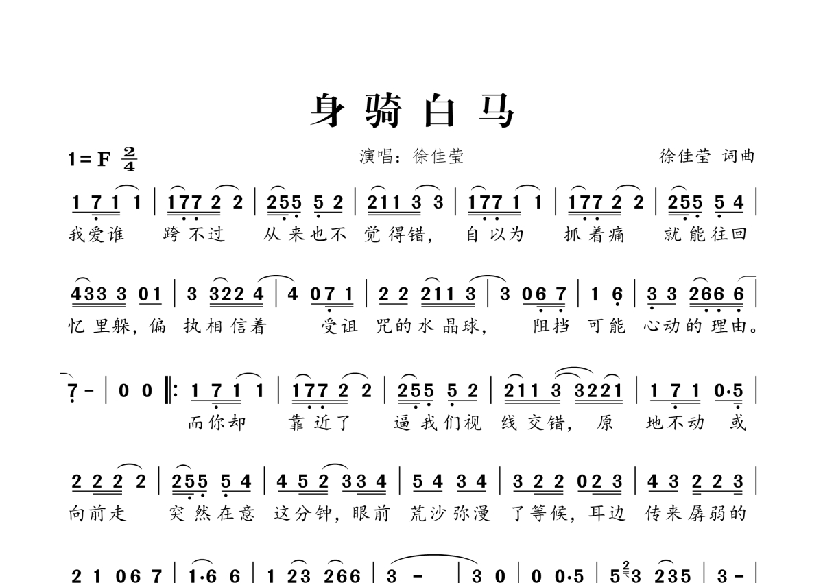《身骑白马》是徐佳莹演唱的一首歌曲,拍号为2/4拍,这份简谱共有两张高清图谱,图谱由 @桃李醉春风 编配上传。