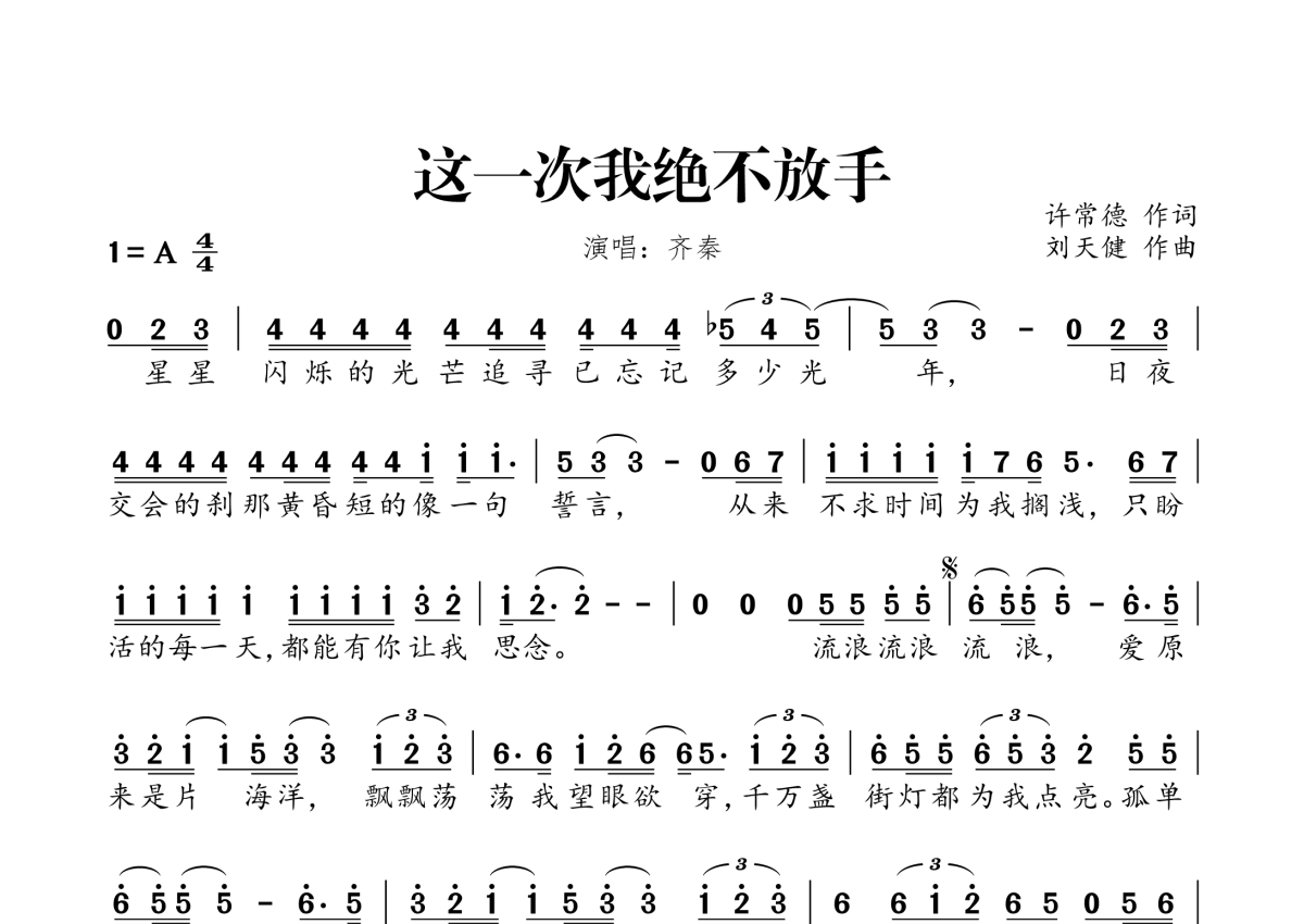 《这一次我决不放手》是齐秦演唱的一首歌曲,拍号为4/4拍,这份简谱共有一张高清图谱,图谱由 @桃李醉春风 编配上传。