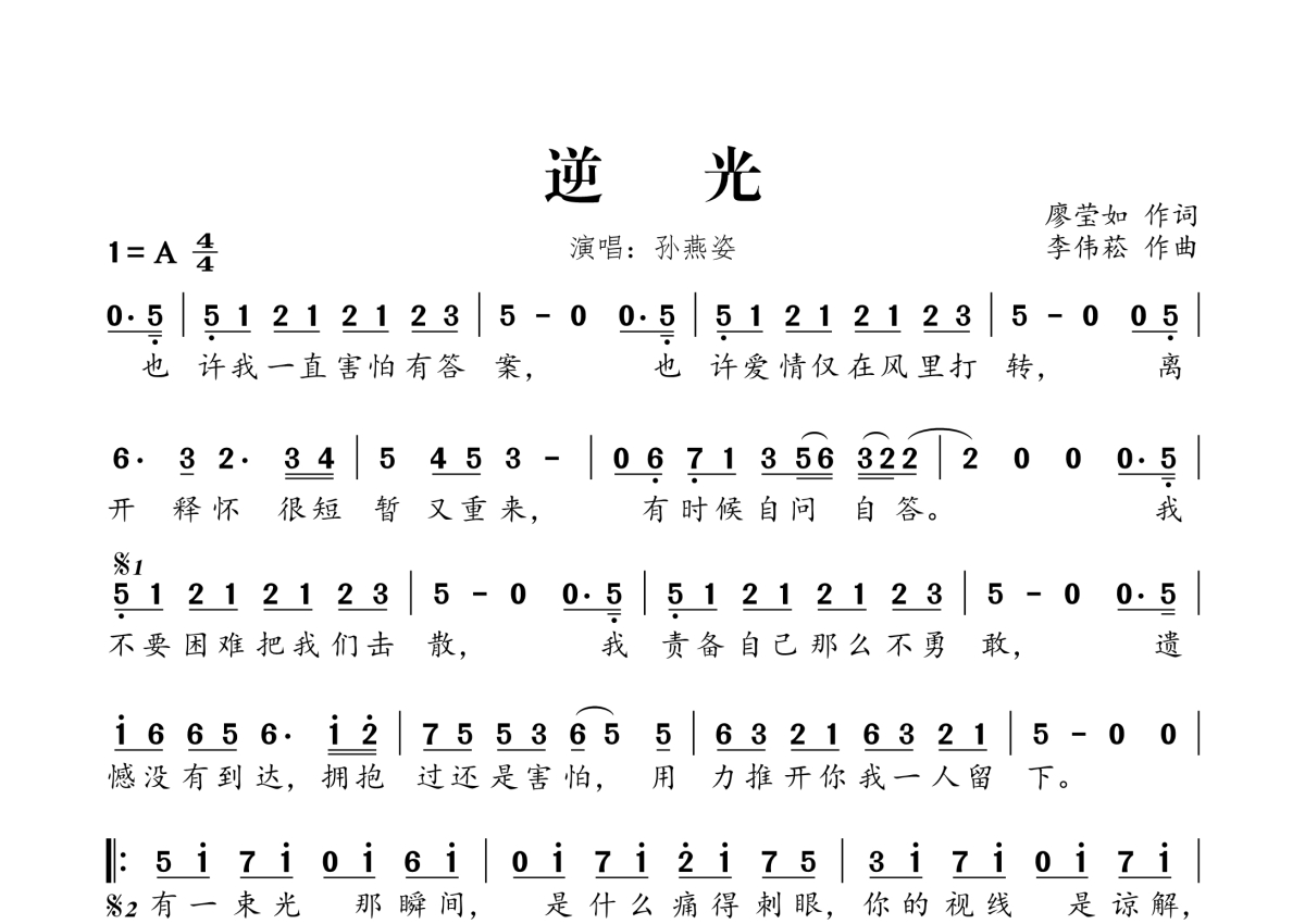 《逆光》是孙燕姿演唱的一首歌曲,拍号为4/4拍,这份简谱共有一张高清图谱,图谱由 @桃李醉春风 编配上传。