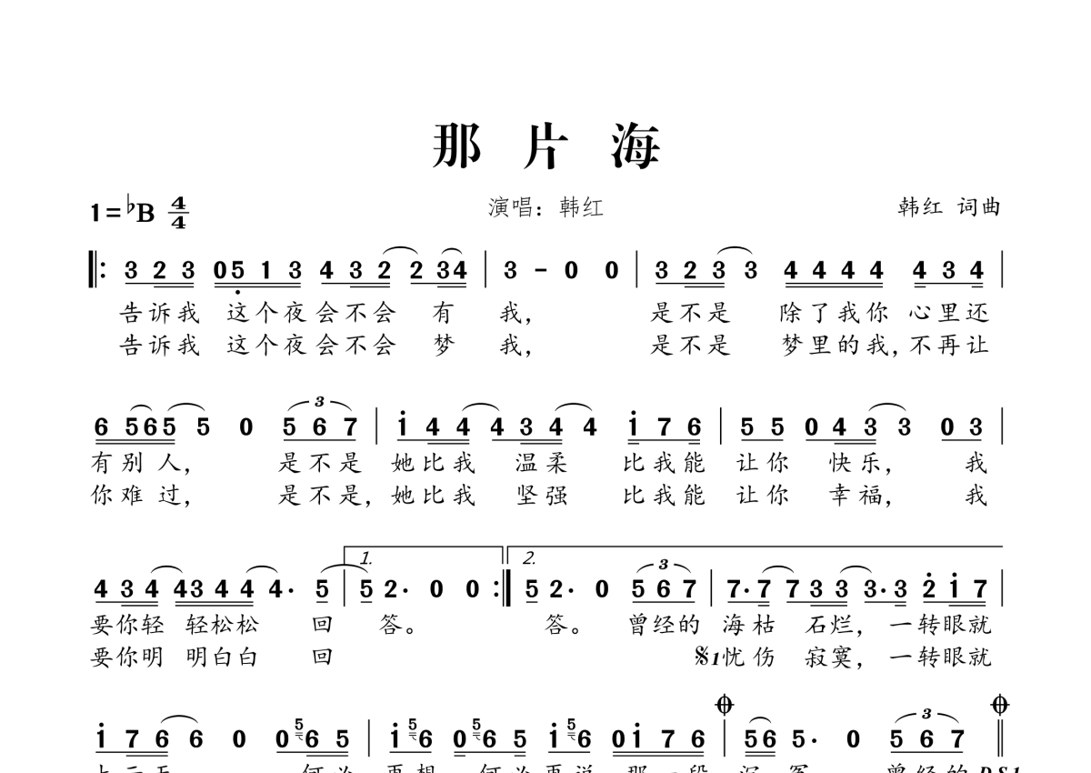 《那片海》是韩红演唱的一首歌曲,拍号为4/4拍,这份简谱共有一张高清图谱,图谱由 @桃李醉春风 编配上传。