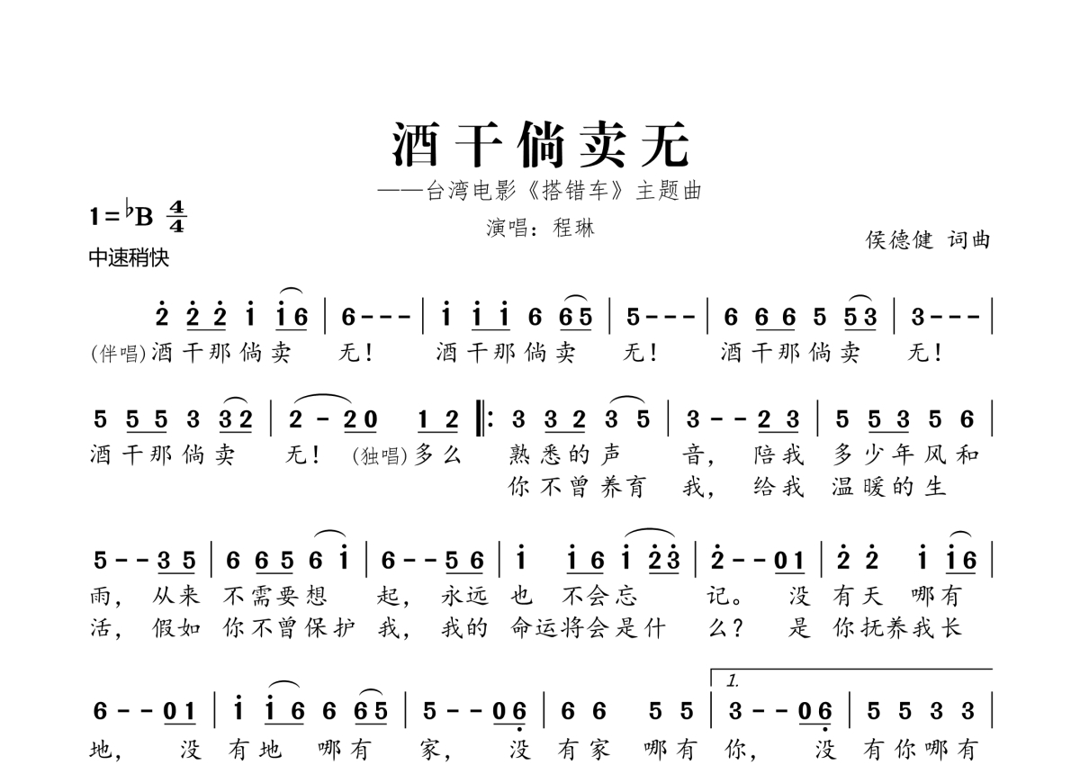 《酒干倘卖无》是程琳演唱的一首歌曲,拍号为4/4拍,这份简谱共有两张高清图谱,图谱由 @桃李醉春风 编配上传。