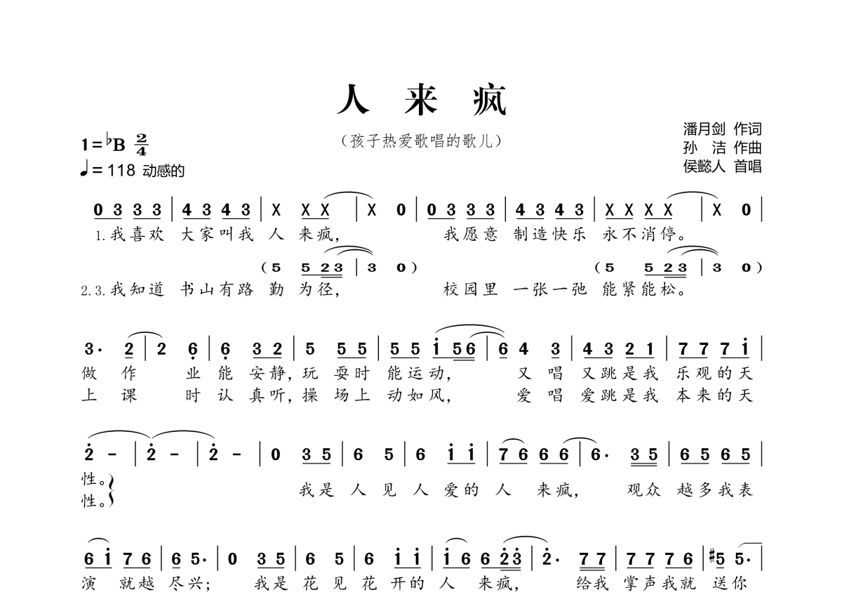 《人来疯》,拍号为2/4拍,歌曲速度为每分钟118拍,这份简谱共有一张高清图谱,图谱由 @桃李醉春风 编配上传。