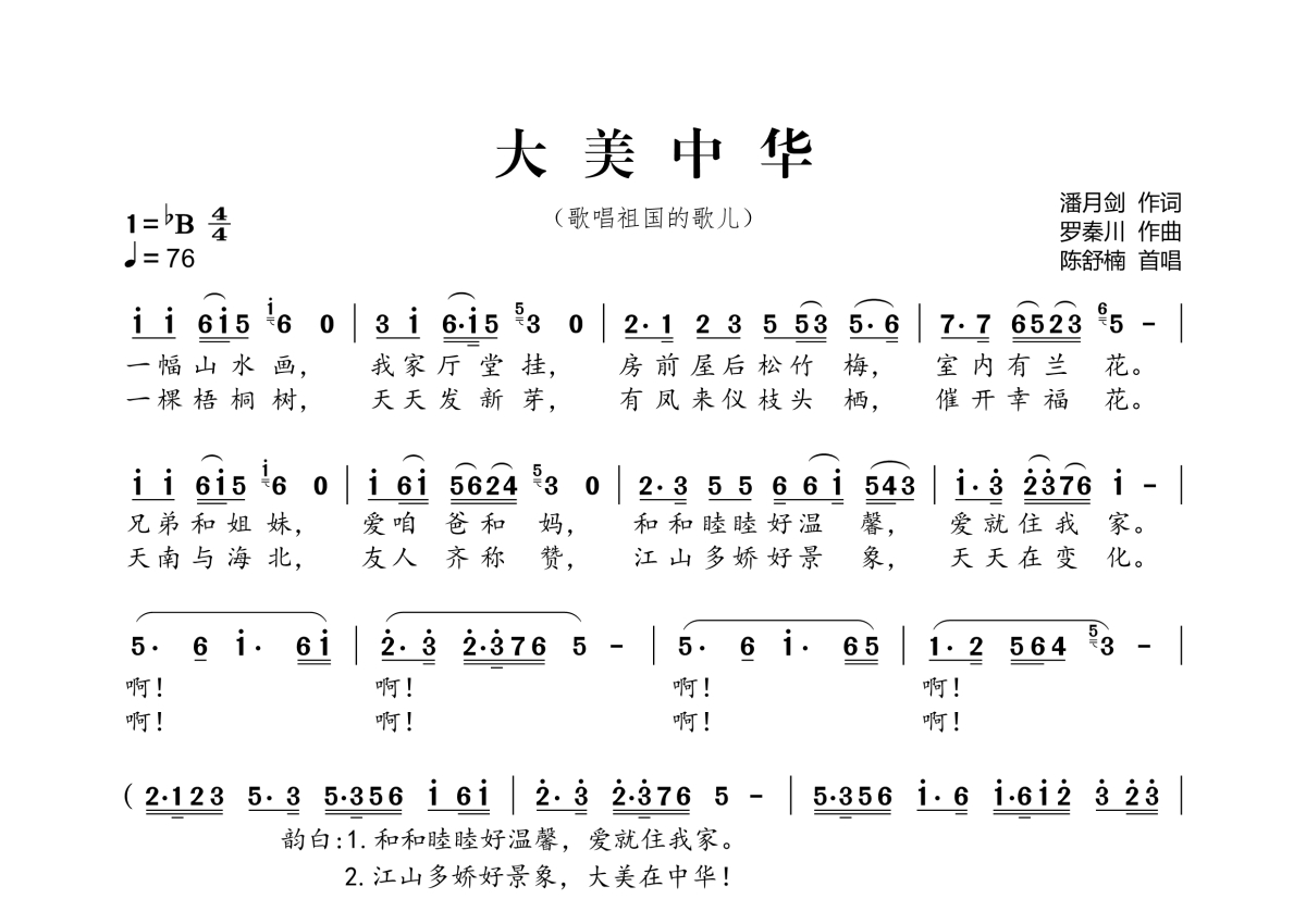 《大美中华》,拍号为4/4拍,歌曲速度为每分钟76拍,这份简谱共有一张高清图谱,图谱由 @桃李醉春风 编配上传。