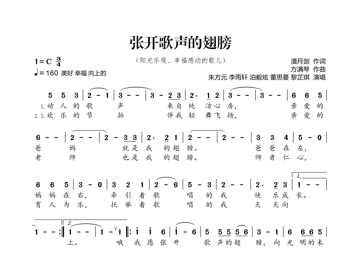 《张开歌声的翅膀》,拍号为3/4拍,歌曲速度为每分钟160拍,这份简谱共有一张高清图谱,图谱由 @桃李醉春风 编配上传。