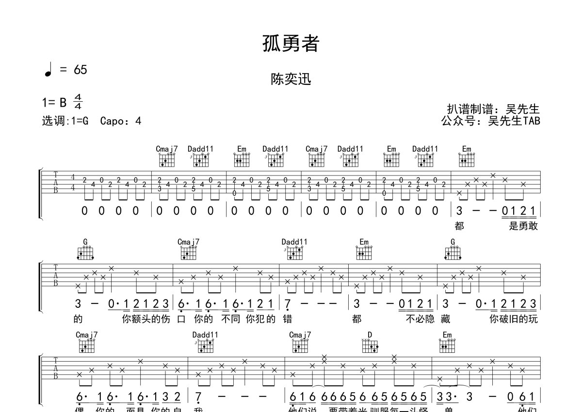 《孤勇者》是陈奕迅演唱的一首歌曲,双页免翻页版,本吉他谱采用的是G调指法编配,这份吉他谱共有两张高清图谱,图谱由 @吴先生TAB 编配上传,图谱使用六线谱编配,包含吉他和弦指法、简谱以及歌词部分,使用这份孤勇者吉他谱,可以让你更加方便地掌握这首歌曲的弹唱技巧,快来尝试吧。陈奕迅《孤勇者》吉他谱_G调吉他弹唱谱_双页免翻页版。
