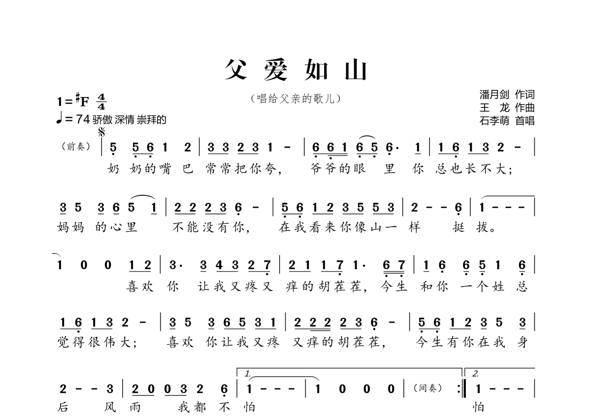 《父爱如山》,拍号为4/4拍,歌曲速度为每分钟74拍,这份简谱共有一张高清图谱,图谱由 @桃李醉春风 编配上传。