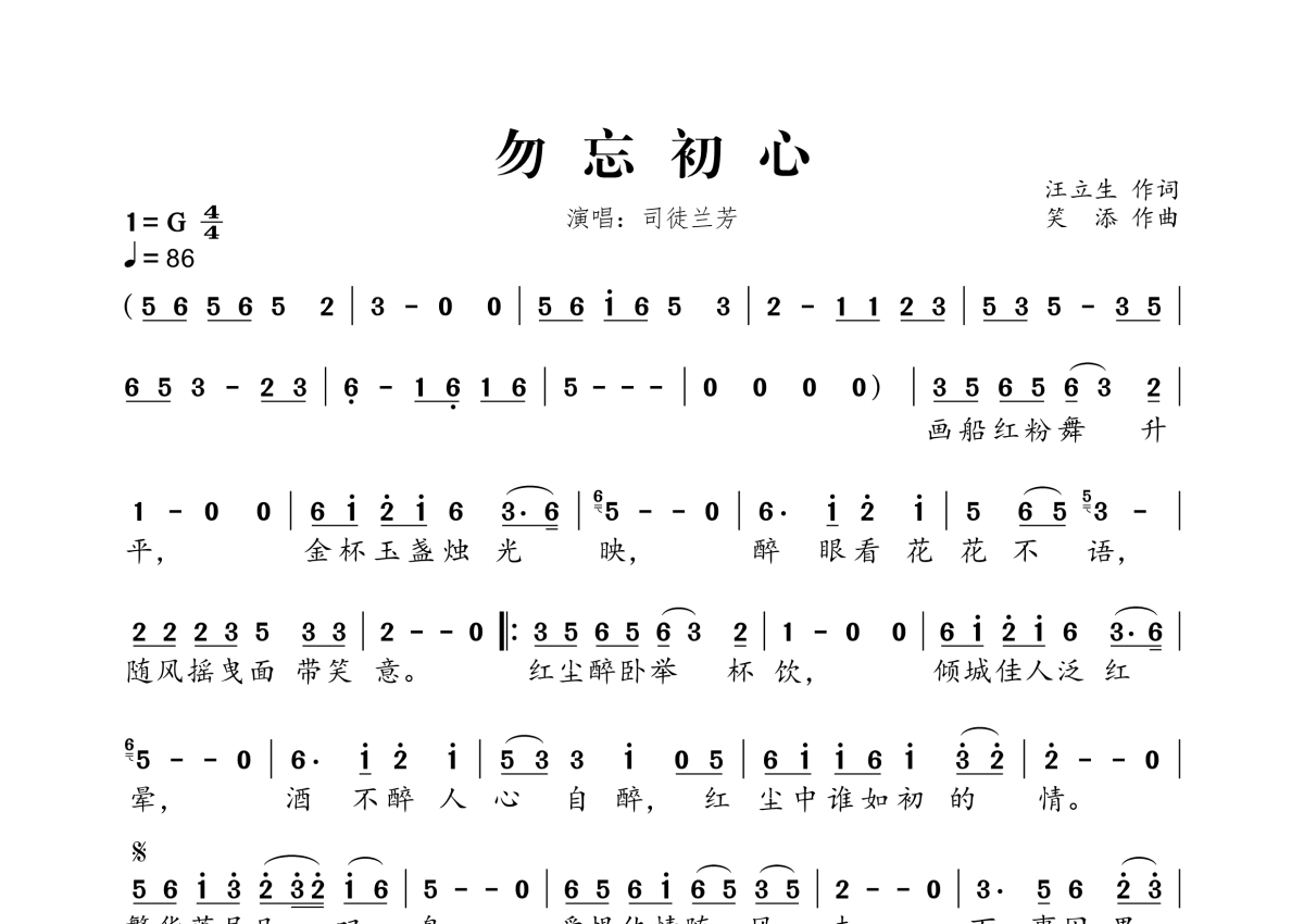 《勿忘初心》是司徒兰芳演唱的一首歌曲,拍号为4/4拍,歌曲速度为每分钟86拍,这份简谱共有一张高清图谱,图谱由 @桃李醉春风 编配上传。
