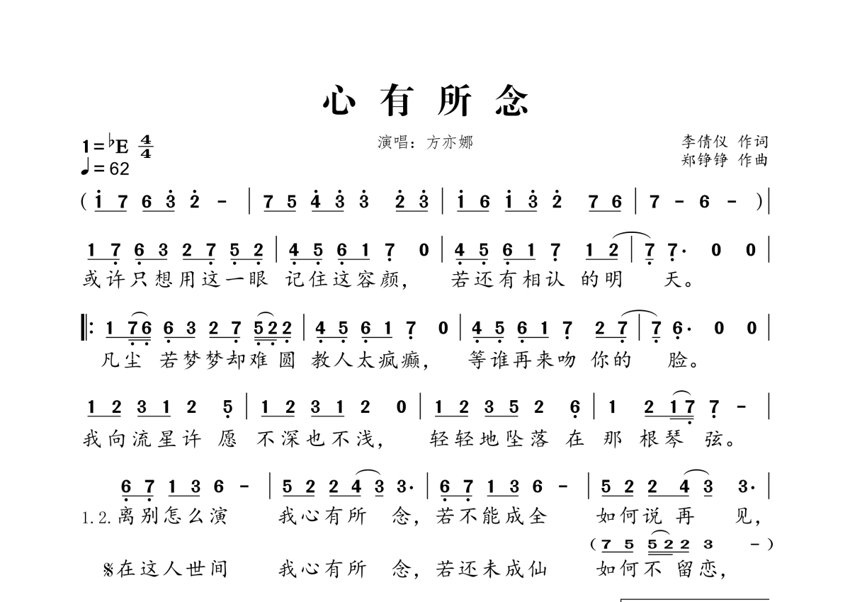 《心有所念》是方亦娜演唱的一首歌曲,拍号为4/4拍,歌曲速度为每分钟62拍,这份简谱共有一张高清图谱,图谱由 @桃李醉春风 编配上传。