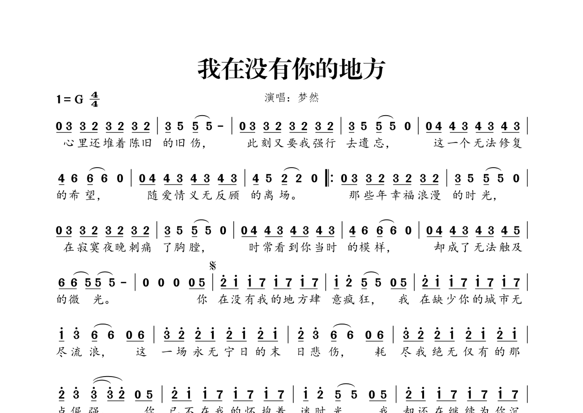 梦然《我在没有你的地方》简谱