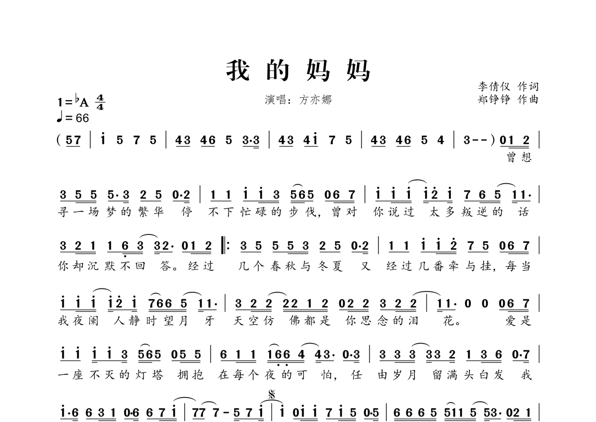 《我的妈妈》是方亦娜演唱的一首歌曲,拍号为4/4拍,歌曲速度为每分钟66拍,这份简谱共有一张高清图谱,图谱由 @桃李醉春风 编配上传。