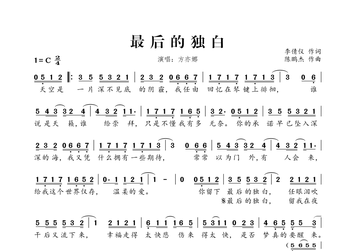 《最后的独白》是方亦娜演唱的一首歌曲,拍号为2/4拍,这份简谱共有一张高清图谱,图谱由 @桃李醉春风 编配上传。