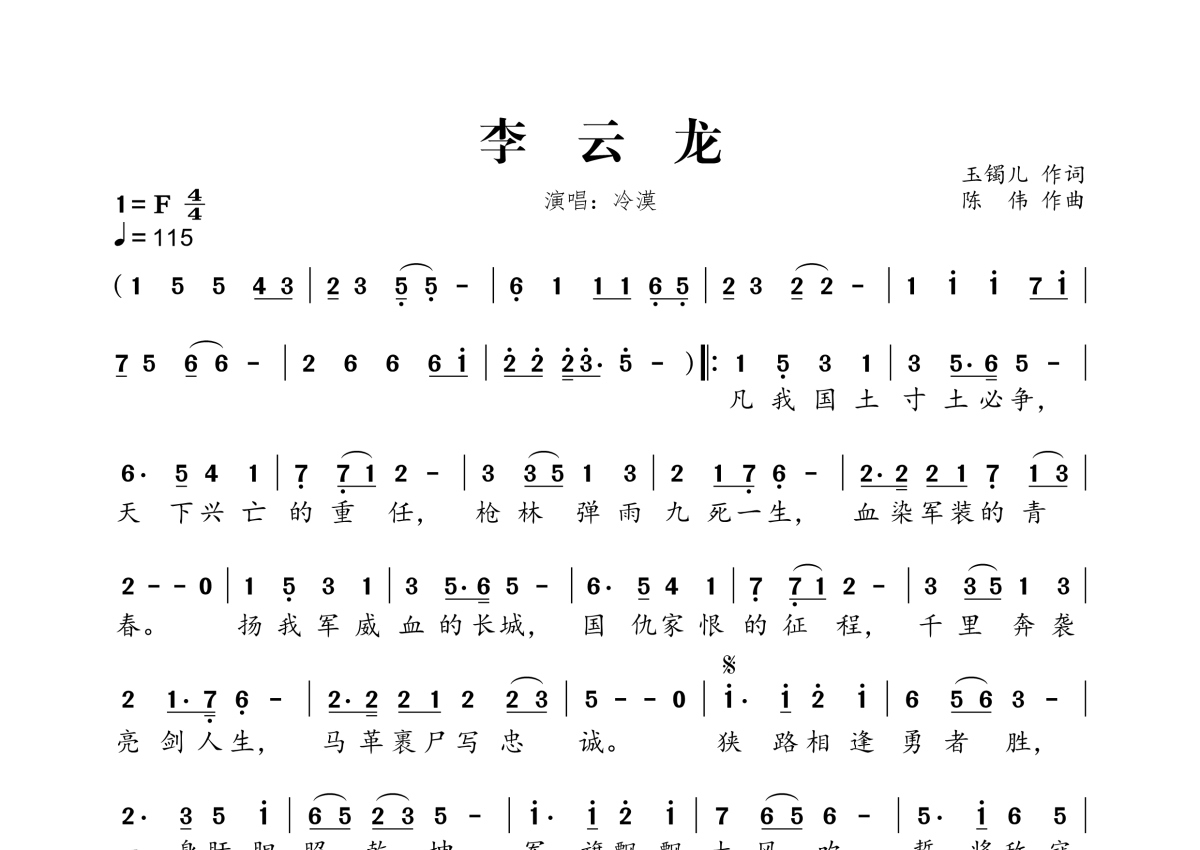 《李云龙》是冷漠演唱的一首歌曲,拍号为4/4拍,歌曲速度为每分钟115拍,这份简谱共有一张高清图谱,图谱由 @桃李醉春风 编配上传。