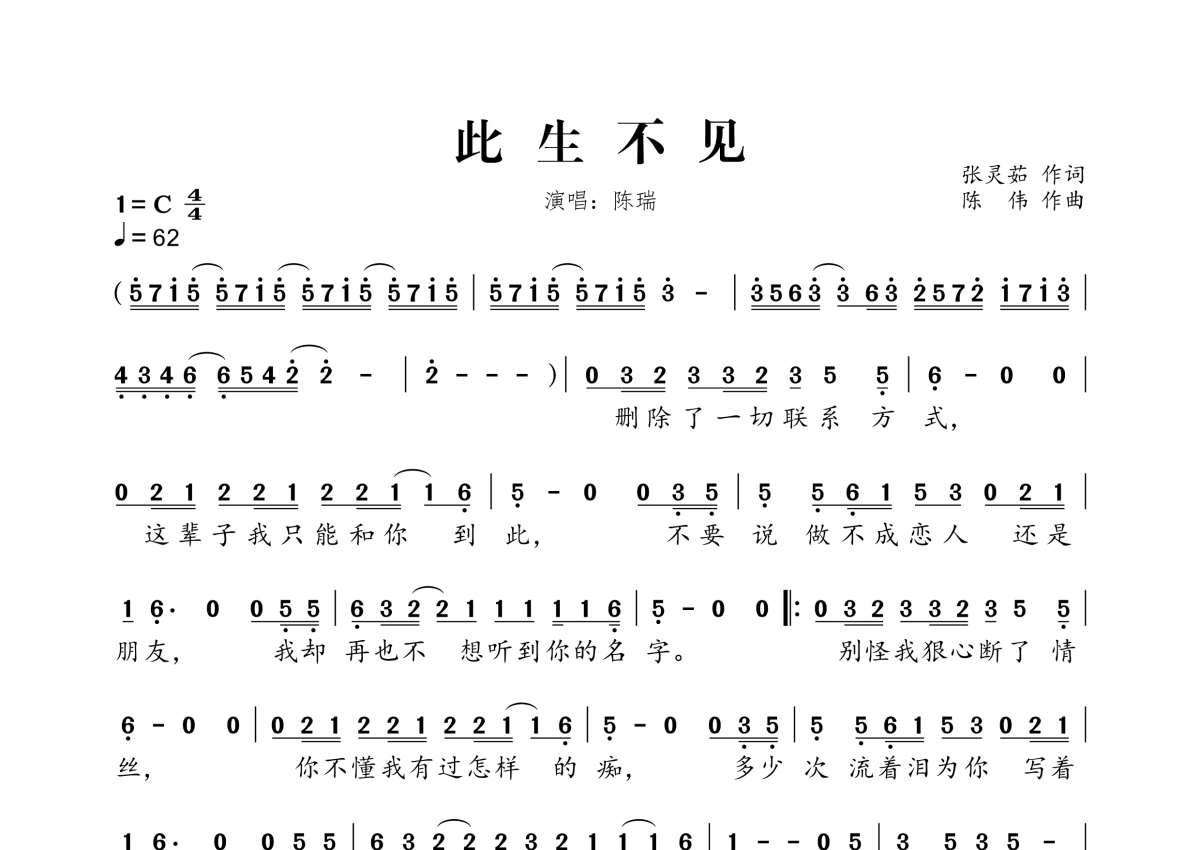 《此生不见》是陈瑞演唱的一首歌曲,拍号为4/4拍,歌曲速度为每分钟62拍,这份简谱共有一张高清图谱,图谱由 @桃李醉春风 编配上传。