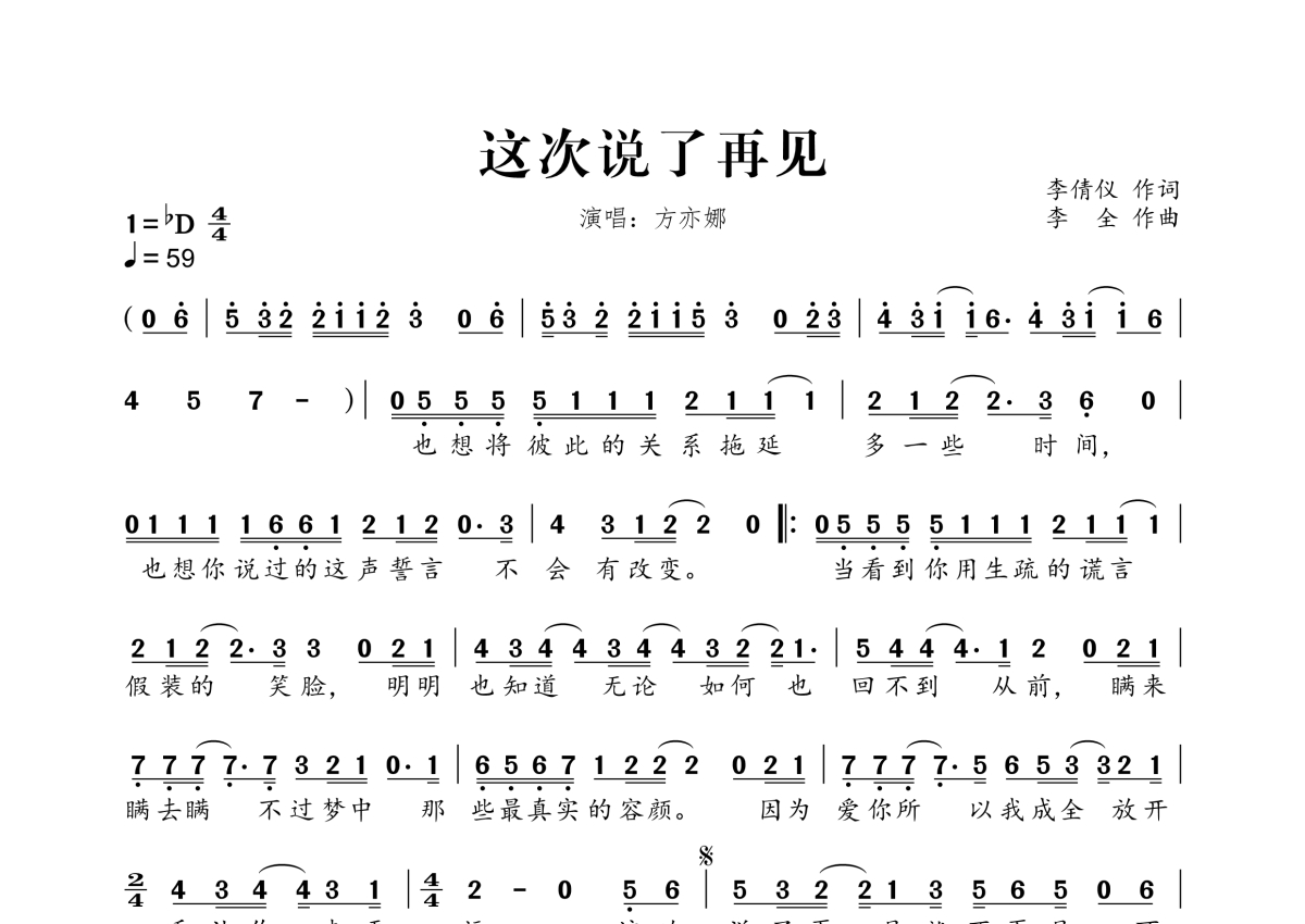 方亦娜《这次说了再见》简谱