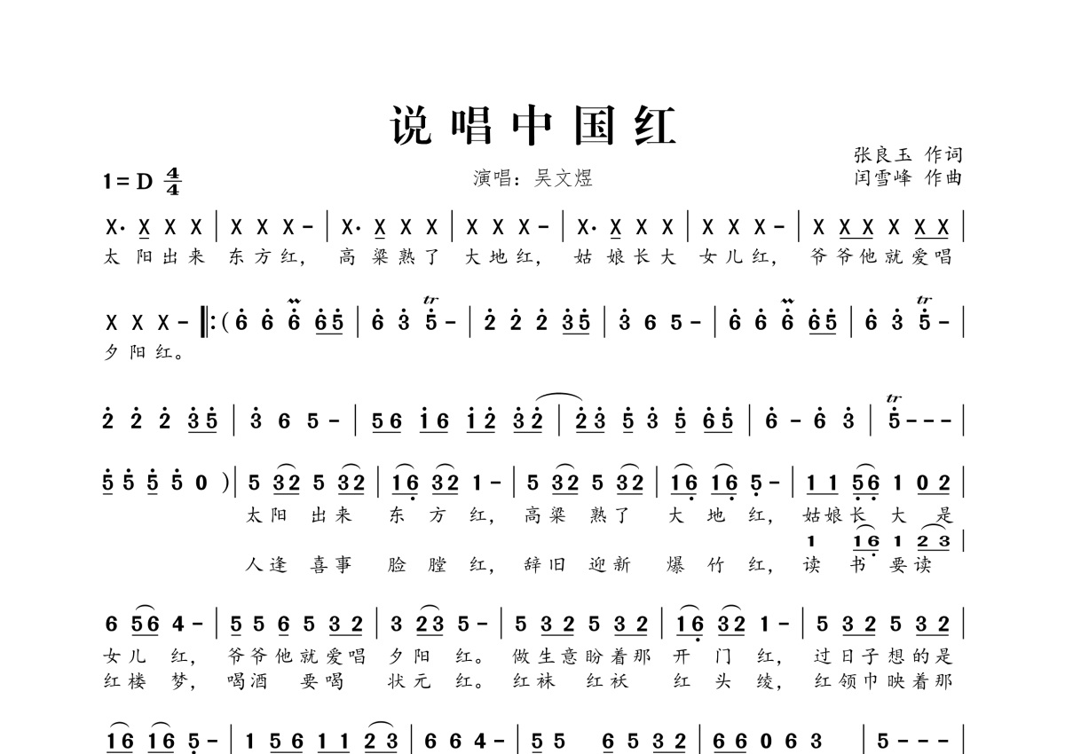 《说唱中国红》是吴文煜演唱的一首歌曲,拍号为4/4拍,这份简谱共有一张高清图谱,图谱由 @桃李醉春风 编配上传。