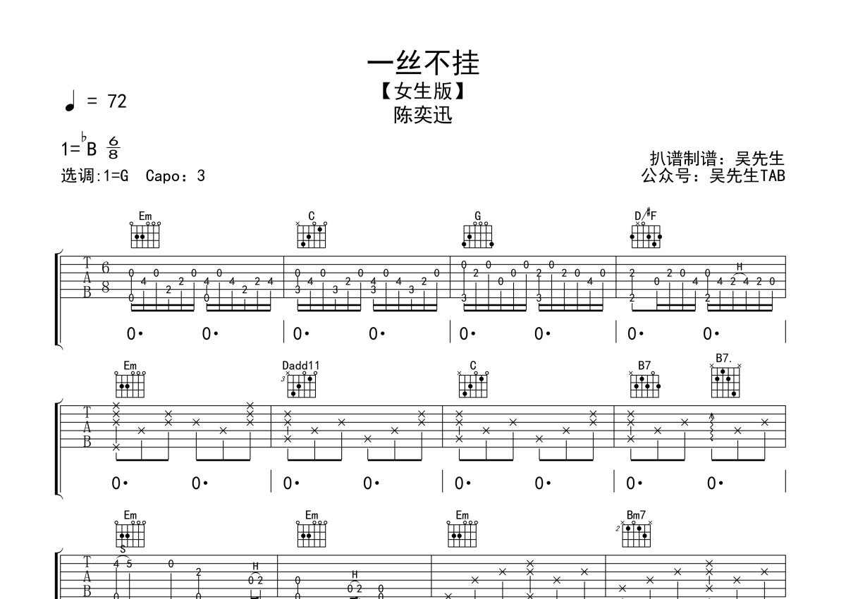 《一丝不挂》是陈奕迅演唱的一首歌曲,女生版,本吉他谱采用的是G调指法编配,这份吉他谱共有四张高清图谱,图谱由 @吴先生TAB 编配上传,图谱使用六线谱编配,包含吉他和弦指法、简谱以及歌词部分,使用这份一丝不挂吉他谱,可以让你更加方便地掌握这首歌曲的弹唱技巧,快来尝试吧。陈奕迅《一丝不挂》吉他谱_G调吉他弹唱谱_女生版。