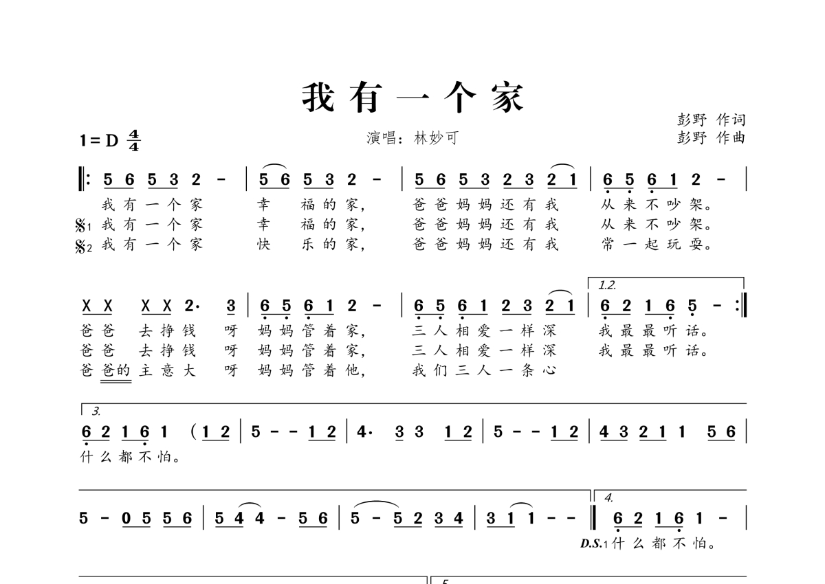 《我有一个家》是林妙可演唱的一首歌曲,拍号为4/4拍,这份简谱共有一张高清图谱,图谱由 @桃李醉春风 编配上传。