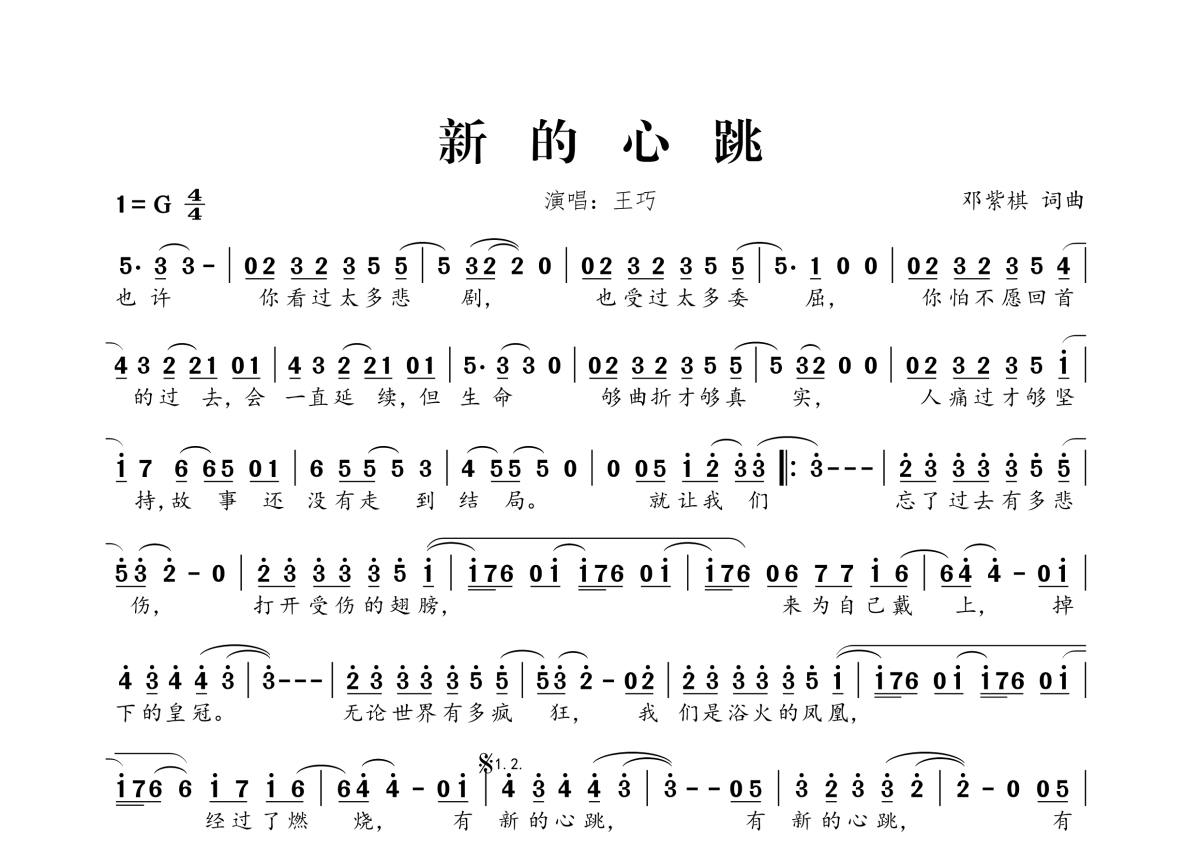 《新的心跳》是王巧演唱的一首歌曲,拍号为4/4拍,这份简谱共有一张高清图谱,图谱由 @桃李醉春风 编配上传。