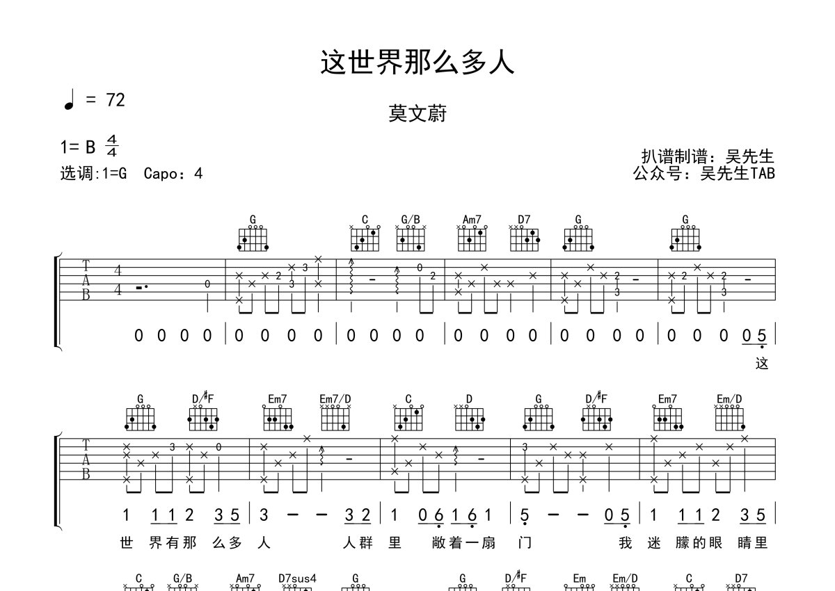 《这世界那么多人》是莫文蔚演唱的一首歌曲,本吉他谱采用的是G调指法编配,这份吉他谱共有两张高清图谱,图谱由 @吴先生TAB 编配上传,图谱使用六线谱编配,包含吉他和弦指法、简谱以及歌词部分,使用这份这世界那么多人吉他谱,可以让你更加方便地掌握这首歌曲的弹唱技巧,快来尝试吧。莫文蔚《这世界那么多人》吉他谱_G调吉他弹唱谱。