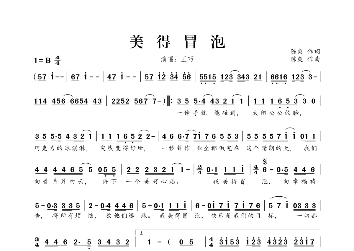《美得冒泡》是王巧演唱的一首歌曲,拍号为4/4拍,这份简谱共有一张高清图谱,图谱由 @桃李醉春风 编配上传。