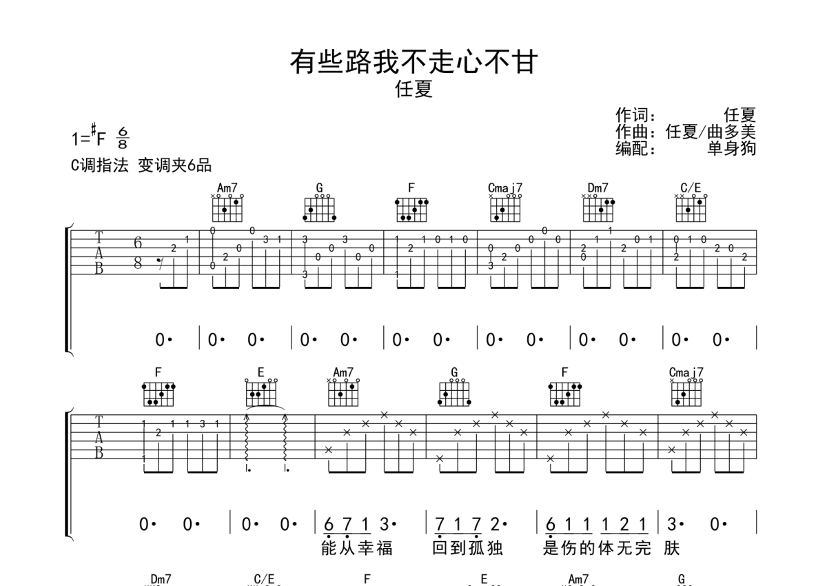 《有些路我不走心不甘》是任夏演唱的一首歌曲,拍号为6/8拍,歌曲原调为Gb调,但由于原调指法比较难,为了方便弹奏,本吉他谱采用的是C调指法编配,变调夹6品弹奏即为原调,当然也可以根据自己的音域改变变调夹位置,或者通过改变和弦调性,以方便自己弹奏,这份吉他谱共有三张高清图谱,图谱由 @单身狗 编配上传,图谱使用六线谱编配,包含吉他和弦指法、简谱以及歌词部分,使用这份有些路我不走心不甘吉他谱,可以让你更加方便地掌握这首歌曲的弹唱技巧,快来尝试吧。