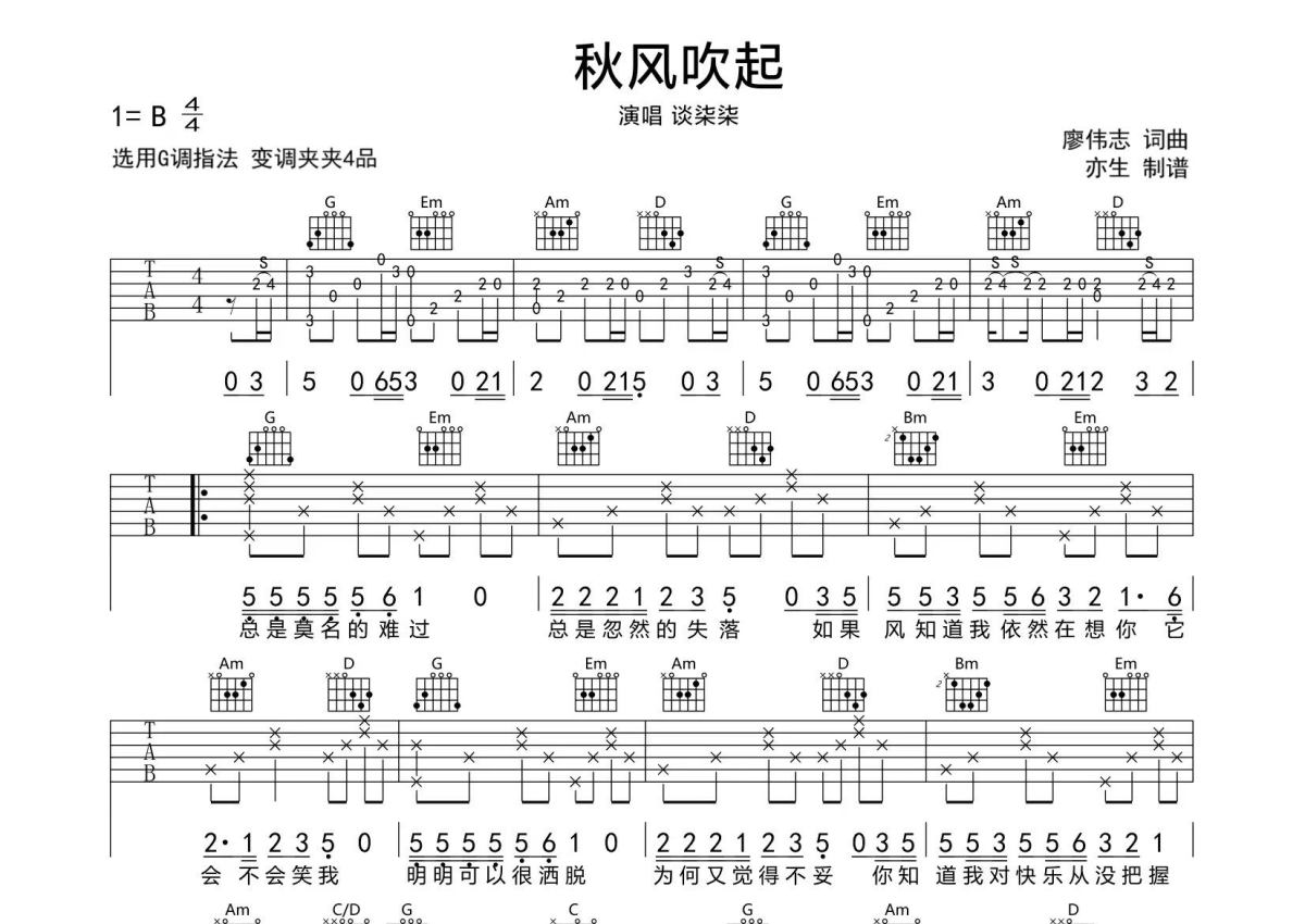 《秋风吹起》是谈柒柒演唱的一首歌曲,拍号为4/4拍,歌曲原调为B调,但由于原调指法比较难,为了方便弹奏,本吉他谱采用的是G调指法编配,变调夹2品弹奏即为原调,当然也可以根据自己的音域改变变调夹位置,或者通过改变和弦调性,以方便自己弹奏,这份吉他谱共有两张高清图谱,图谱由 @亦生 编配上传,图谱使用六线谱编配,包含吉他和弦指法、简谱以及歌词部分,使用这份秋风吹起吉他谱,可以让你更加方便地掌握这首歌曲的弹唱技巧,快来尝试吧。