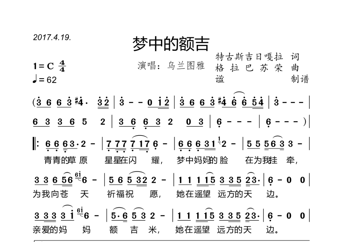 《梦中的额吉》是乌兰图雅演唱的一首歌曲,拍号为4/4拍,歌曲速度为每分钟62拍,这份简谱共有一张高清图谱,图谱由 @谧 编配上传乌兰图雅演唱的《梦中的额吉》,2017.4.19.发行,原唱版本,完整简谱,C调,4/4拍,速度62,谧精心制谱,共1页。