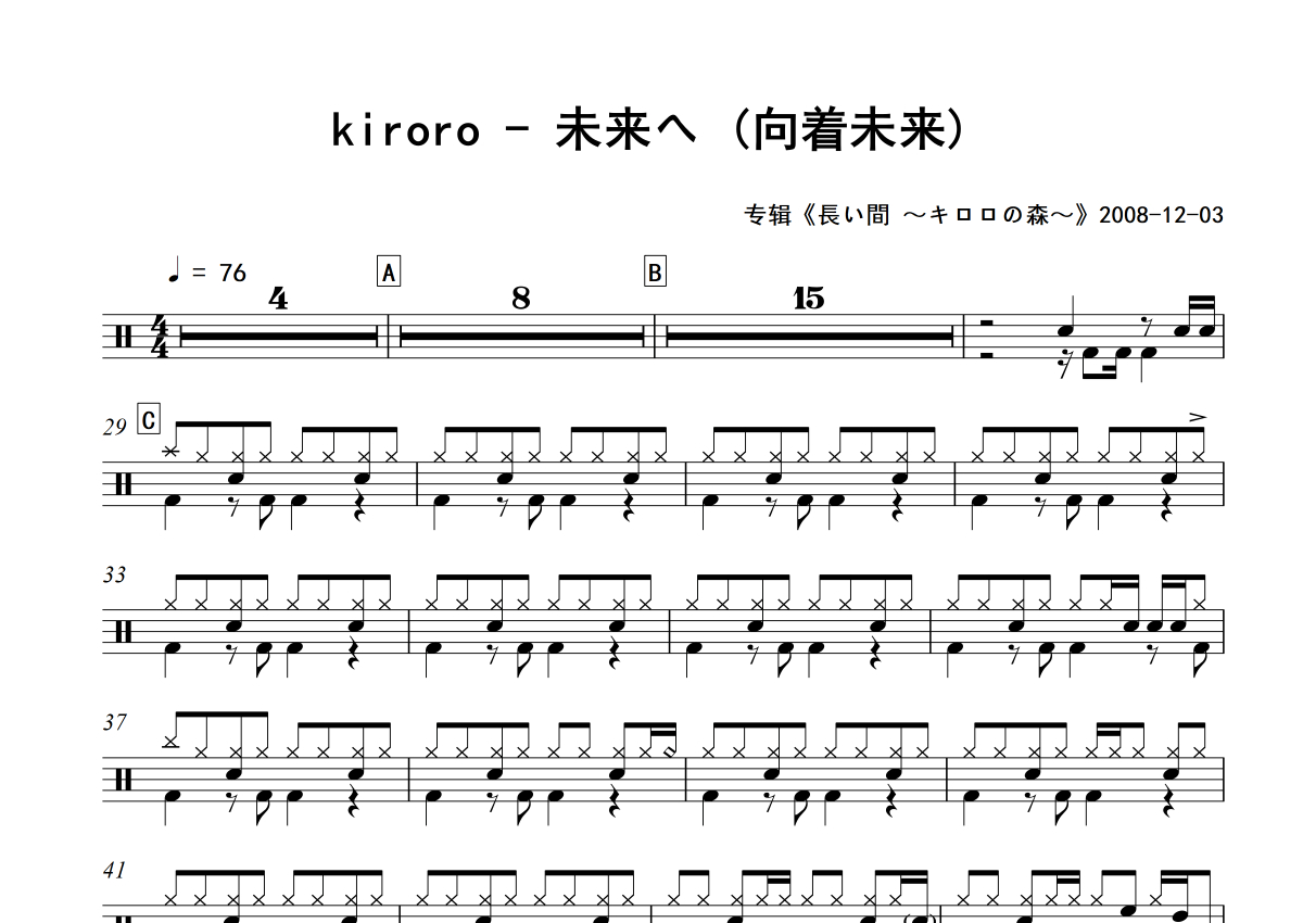 《未来へ (向着未来)》是kiroro演唱的一首歌曲,专辑版,拍号为4/4拍,歌曲速度为每分钟76拍,这份架子鼓谱共有两张高清图谱,图谱由 @举个例子 编配上传,图谱使用五线谱编配,使用这份未来へ (向着未来)架子鼓谱,你将能够轻松地敲打出这首kiroro的未来へ (向着未来),快来尝试吧。