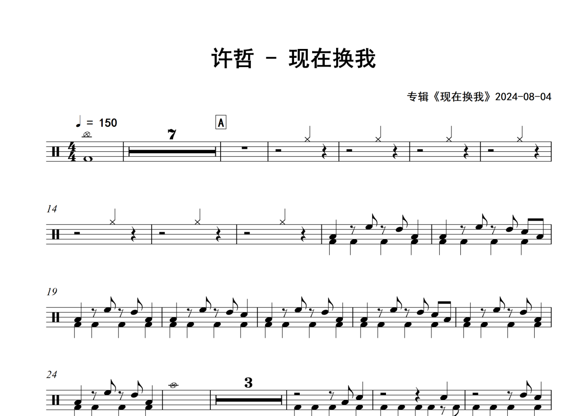 《现在换我》是许哲演唱的一首歌曲,专辑版,拍号为4/4拍,歌曲速度为每分钟150拍,这份架子鼓谱共有三张高清图谱,图谱由 @举个例子 编配上传,图谱使用五线谱编配,使用这份现在换我架子鼓谱,你将能够轻松地敲打出这首许哲的现在换我,快来尝试吧。